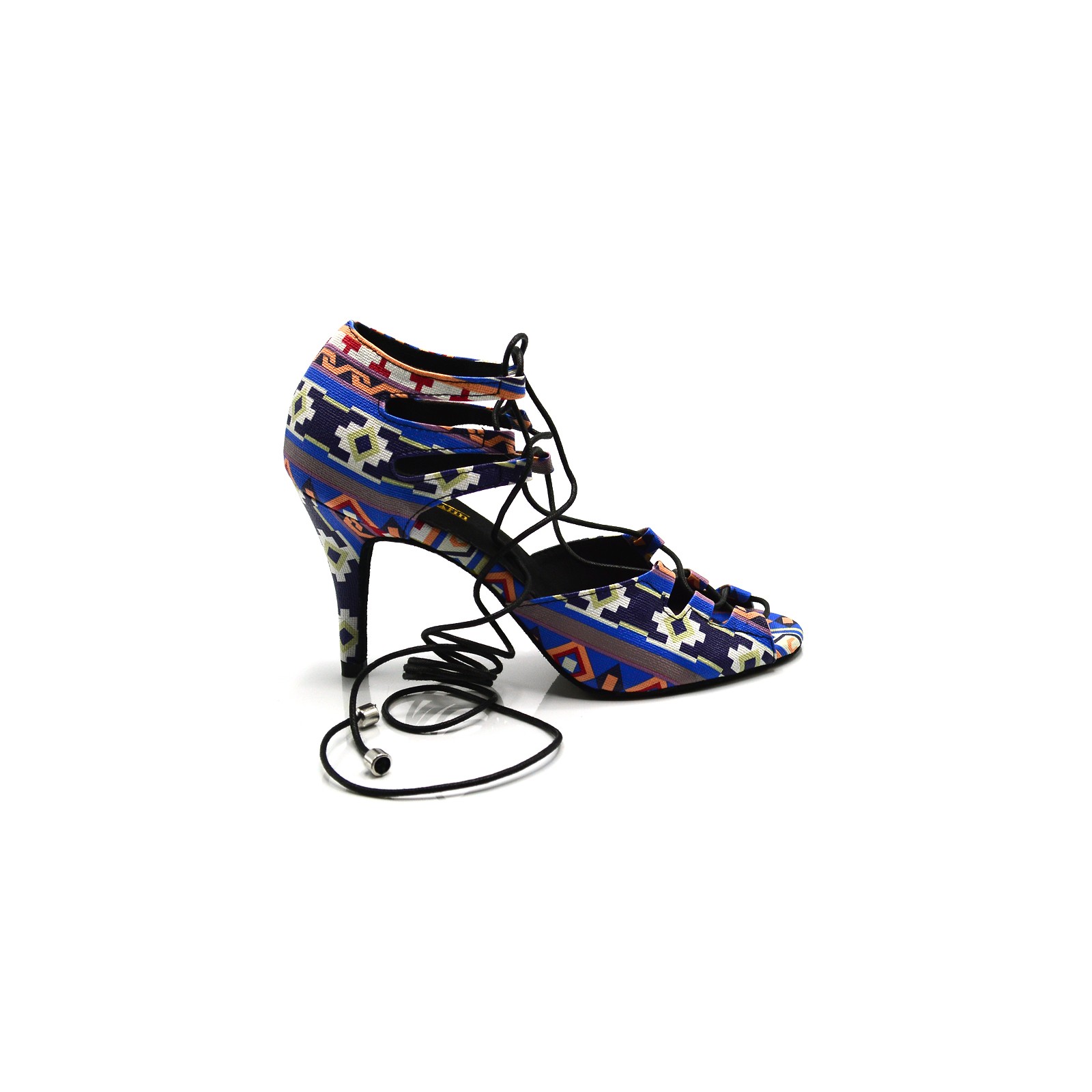 Chaussure de danse Xara Label Latin talon 8,5cm en simili cuir imprimé wax avec une semelle nubuck pour une pratique en intérieur. Convient pour toutes les danses à fréquence régulière et/ou occasionnelle