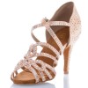 Optez pour cette magnifique chaussure de danse salsa composée de satin tan flesh (beige rose) et strass.